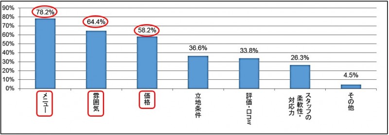 下記のデータは『OpenTable』を運営するオープンテーブル株式会社が「ディナーのレストランを選ぶ決め手を教えてください」というアンケートを実施した結果です。