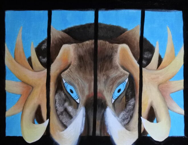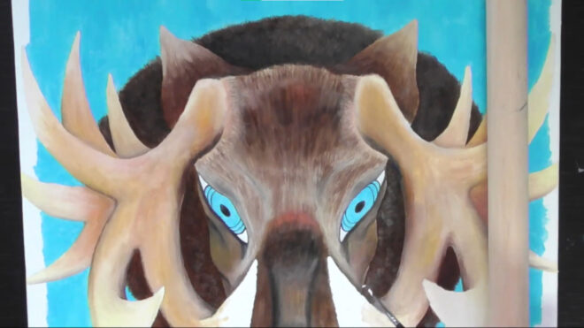 後ほど加筆しますがキャンバスの外側を黒く塗る予定なので、黒枠に遮られる角と黒枠よりも前に出てくる角を分けて描いていきます。