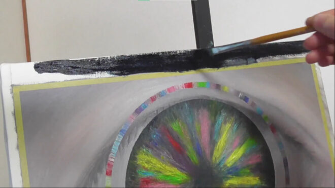 マスキングテープを貼ったら瞳部分を描き、黒帯部分に取りかかります。