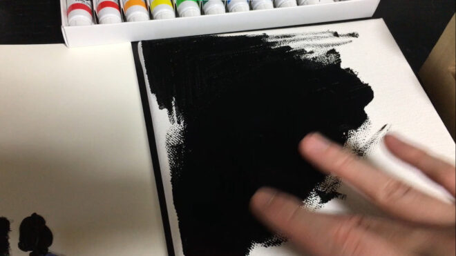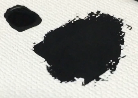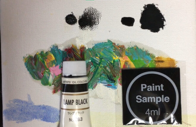 見え方を確認するために、油絵の具のランプブラックと並べてキャンバスに出してみます。