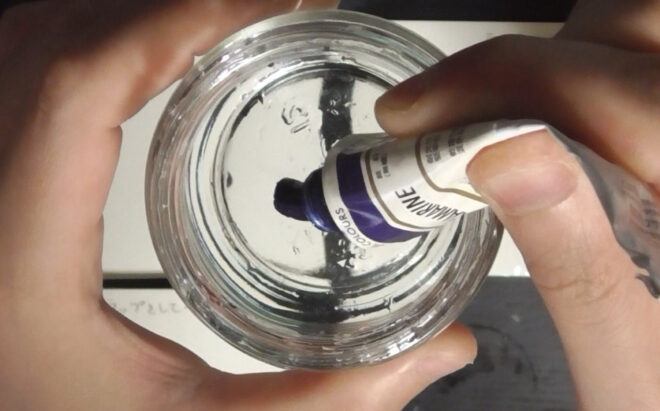 今回は「イエローオーカー」と「ウルトラマリン」の2色を、水を入れたビンの中に入れて放置してみます。