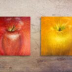 小さな四角いキャンバスいっぱいに描いた青りんごの油絵。