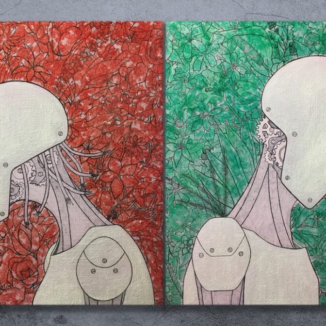2枚1対で飾る絵となっていて、飾る位置を変えることで2体の関係性を変えることができます。