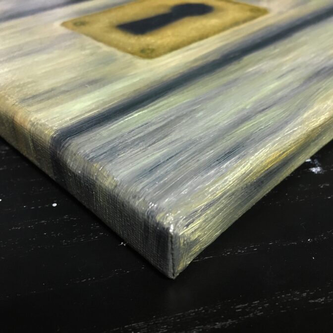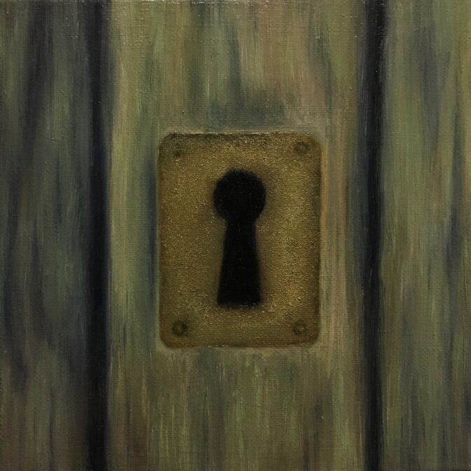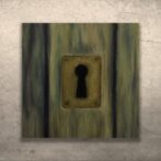 木製のドアにある鍵穴をモチーフにしたアンティーク調の油絵インテリアです。