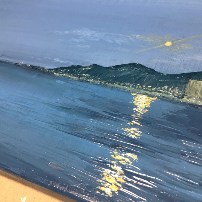 主にペインティングナイフで描いていますので、画面の凹凸感も楽しめる絵になっています。