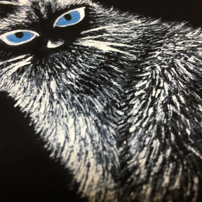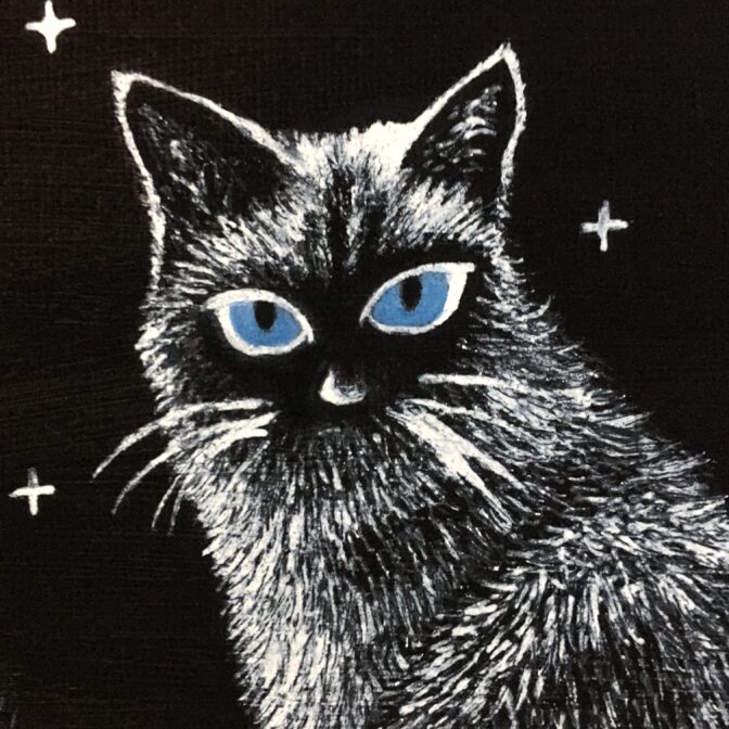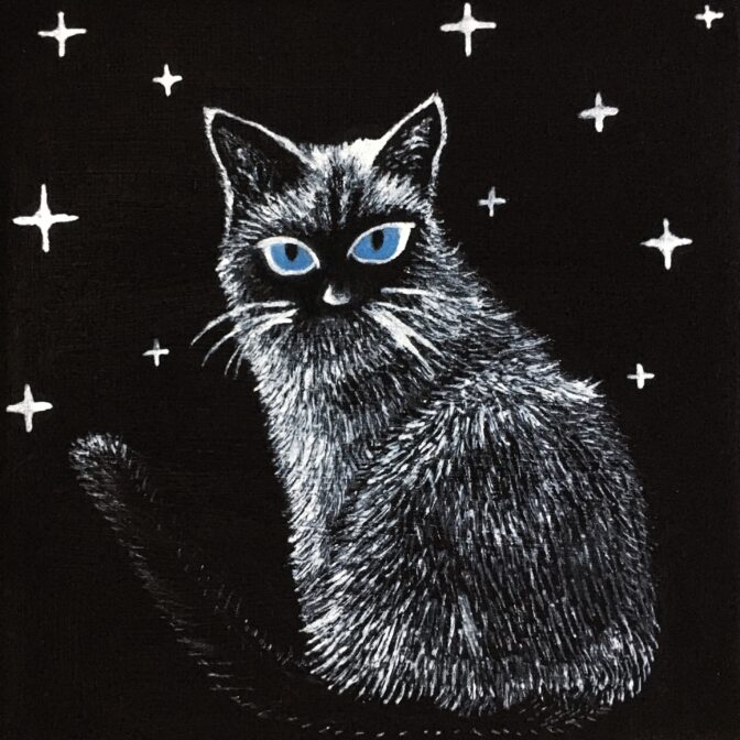 真っ黒の下地に白で描いたシャム猫の油絵です。